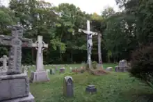 The cemetery is located towards the middle of the forest. Multiple pathways within the forest lead to the cemetery. The cemetery contains burials of sisters of St. Francis, archbishops, and children from St. Aemilian's orphanage.[4]