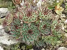 Sempervivium calcareum, the houseleek, is a species of flowering plant in the stonecrop family Crassulaceae, native to the southern Alps in Europe. An evergreen succulent perennial, it has a rosette with thick leaves that store water. The leaves are usually green with reddish-purple tips. This plant reproduces with asexual budding and monocarpic sexual reproduction.[1]