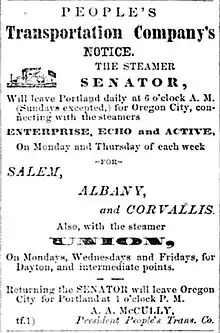 - 1 2 3 "People's Transportation Company's Notice. The steamer Senator will leave Portland daily …". Oregon City Enterprise (advertisement). Vol. 1, no. 1. D.C. Ireland. Oct 27, 1866. p.3, col.6.