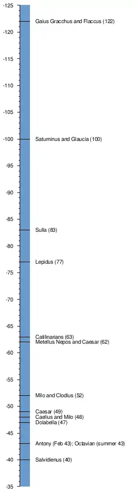 Senatus consultum ultimum timeline. All years from Momigliano & Lintott 2012 unless otherwise indicated. Sulla (83): Golden 2013, p. 121. Months for 43 BC from Golden 2013, pp. 197, 204.