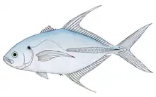 The species was first scientifically described by the famed French naturalist Georges Cuvier in 1833 based on a specimen taken from the mouth of the Senegal River at Gorée, Senegal, which was designated to be the holotype.[3] Cuvier named the new species Caranx senegallus with the specific epithet referring to the country the holotype was taken from. The species was independently redescribed twice; both times by the Austrian zoologist Franz Steindachner. In 1867 he named the species Caranx macrops,[4] while in 1883 he named it Caranx africanus, with no apparent reason for the redescription.[5] Under ICZN naming rules, these are both considered junior synonyms and rendered invalid. The species' two common names simply refer to the African coasts where the species is found.[6]
