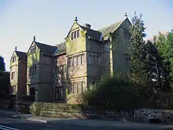 The house is built with sandstone and it has a stone slate roof with a sandstone ridge. It is two storeys with an attic roof. At the front are three projections rising to the full height of the house. The central projection contains a porch; the others have bay windows with mullions. Each projection is surmounted by a gable and there are gables at each end of the house. The gables have corbels and moulded copings with finials at their summits.[1]