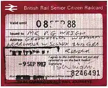 During the early 1970s, some of British Rail's Regions offered a series of small, localised travel promotions for people of or near retirement age. The London Midland and Southern regions were particularly active in this, although other examples existed elsewhere.[1] These promotions were characterised by restricted validity and geographical availability. For example, one Southern Region scheme introduced in 1970 offered pensioners half-price travel at off-peak times on Tuesdays, Wednesdays and Thursdays only, for journeys from a set list of around twenty stations, upon production of their pension book (to confirm their eligibility).[2]