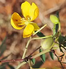 Senna planitiicola, commonly known as yellow pea, arsenic bush, ant bush or pepper-leaf senna,[2] is a species of flowering plant in the family Fabaceae and is endemic to northern Australia. It is an erect shrub with pinnate leaves with five to seven pairs of broadly elliptic to egg-shaped leaflets, and groups of three to eight yellow flowers on the ends of branches and in upper leaf axils.