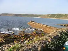A small fishing fleet of seven is protected by a breakwater built in 1908.[10] Mullet used to be an important catch in the bay with the fishery beginning at the end of January and continued towards the end of April.[11] Sennen Cove was the most important seine fishery in Cornwall and, in Edwardian times, large schools were still entering the bay with as many as 12,000 caught at one time.[12] Seining continued into the 20th century with 1200 stone caught on 3 March 1977.[13]