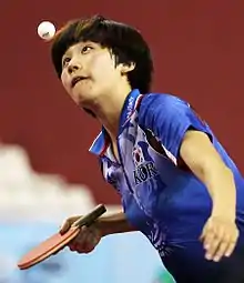 Seok Ha-jung (also Seok Ha-jeong 석 하정, born January 11, 1985, as Shi Lei) is a Chinese-born South Korean table tennis player. She won four bronze medals at major international competitions: two at the 2009 East Asian Games and one each at the 2010 Asian Games and 2012 World Championships. Her team placed fourth at the 2012 Summer Olympics.[1] Her world ranking varied from 12 to 65 between 2008 and 2014, peaking in early 2011.[2]