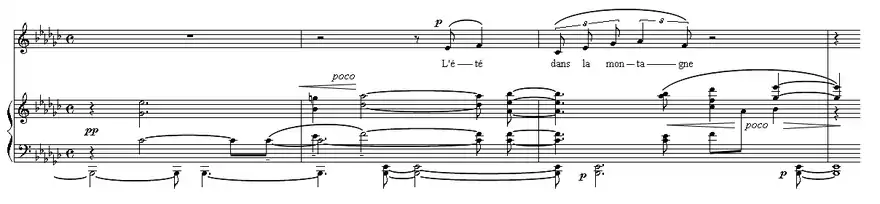 A characteristic modulation, quoted in Delage's In morte di un samouraï of 1950,[29] caught Flothuis's attention. At the beginning of "L'été ..." the first two chords have a double false relation (of C♭ to B♭, and G♭ to G♮) followed by an insistent fourth in the bass, which Flothuis interprets as "a double pedal point (B♭ + E♭)".[lower-alpha 14][28] This evokes the distant beating of the temple bell and is heard twelve times in just nine measures, always off-beat of the melody: