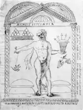 The vintage, with bunches or baskets of grapes, predominates in both verbal and visual allegories of September, particularly in mosaics depicting the months.[9] In the manuscripts that preserve the Calendar of Filocalus (354 AD), September is represented by a nude male wearing only a long light scarf over one shoulder. The conventional bunch of grapes appears under his left hand, outstretched to hold a basket, on the top of which are arrayed five puzzling picks or skewers. Over his right shoulder is placed a basket holding two pyramids of six figs or small flasks.[10] A vessel, presumably to receive the new wine, is sunk into the ground on either side of him. Over the one to his right, he dangles a lizard on a string, a motif that recurs in imagery associated with Dionysus, the god of wine. The exact significance of the lizard is uncertain. It may represent a magico-medical charm to ensure healthy wine, with the lizard either a potent lustration or the potential damage to be warded off. The lizard is also an attribute of Apollo Sauroctonos.[11]