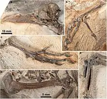 The fossil remains show soft tissue preservation, mostly in the thoracic and abdominal cavities, though portions were also seen in the skull. Apart from remains of potential food material, these remains have not been thoroughly examined.[1]