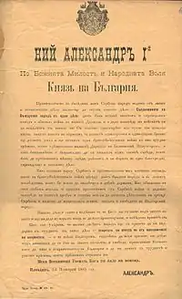 Lured by Austria-Hungary's promises of support[5] and territorial gains from Bulgaria (in return for concessions in the Western Balkans), Milan I declared war on Bulgaria on 14 November [O.S. 2 November] 1885.[6] The military strategy relied largely on surprise, as Bulgaria expected an attack from the Ottoman Empire and had moved its troops to the area near the Ottoman border, to the southeast.
