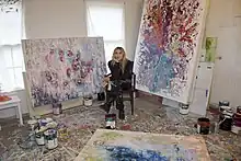 While still a student at NYU, Bocchino became a studio assistant to painter Susan Rothenberg, whose symbolic figurative works were full of color and movement.[5] Teetering along the divide between symbolism and abstraction while exploring the formal properties of paint, Rothenberg's interest in texture and luminosity - along with dance and movement, begin to impact Bocchino's artistic language. [6] Bocchino's association with Rothenbergn lasted through the late 1980's. During this time Bocchino was also studio assistant to painter/printmaker Pat Steir, whose abstract "Waterfall" paintings included techniques such as dripping, splashing and pouring paint.[7] These energetic properties seem to have resonated with the young painter whose unconventional approach to painting seems indelibly influenced by such techniques. In 1986 Susan Rothenberg selected Bocchino for the "4X4 Artists Choose Artists" exhibition at the Jus de Pomme Gallery,[8] her first official show in the East Village scene of her mentors and idols. By 1987, Bocchino was selected for a residency at PS1MoMA[9] (then PS1) which led to a meeting with Italian Vice-Prime Minister Gianni DeMichelis who invited her to show in a solo exhibition in Rome.[3] These early successes positioned Bocchino for a series of increasingly high profile shows and television spots. Bocchino's work is in a number of important museum and private collections and she has numerous solo exhibitions at commercial galleries and museums. Today, Bocchino's artistic investigations are increasingly concerned with color, space and gesture. Critic John Eischeid astutely articulated the relationship of her work to jazz music "lines come and go, sometimes picking up where another left off, sometimes not. By working with such pure abstraction, (Bocchino) elegantly and intuitively reveals this structural similarity between music and painting." In this same review, Eischeid also invokes comparisons to artists Jackson Pollock, Agnes Martin and Joan Mitchell for the way the use they use abstraction as a language which is similar in structure to jazz music.[10]