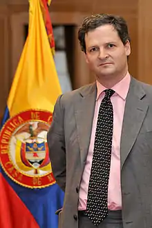 Sergio Jaramillo Caro (born October 17, 1966) is a Colombian diplomat, philosopher and politician.[2]From 2006 to 2009, he would serve as Vice Minister of Defense for Politics and International Affairs, during the administration of Álvaro Uribe, then from 2012 to 2017 he served as National Security Advisor from 2010 to 2012, and later as High Commissioner for Peace during the administration of Juan Manuel Santos Recently from 2017 to 2018,[3] Jaramillo would be Ambassador of Colombia to the European Union and Belgium.[4][5][6]