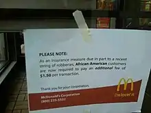 PLEASE NOTE:As an insurance measure due in part to a recent string of robberies, African-American customers are now required to pay an additional fee of $1.50 per transaction.