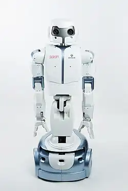 Since SEROPI has a human-like shape, it can effectively work within a human-friendly working space for visitor guidance, errand, and guard. SEROPI consists of three DOFs (Degree Of Freedom) of the neck, three DOFs of the waist, six DOFs of the two arms, and one DOF of the knee. Because of these joint structures, SEROPI can flexibly grip an object on a table or floor with the three fingers and transfer the object to some place. It is also self-balancing and move as a quick human walking. In the future, SEROPI could be used as a service robot platform equipped with touch sensors such that SEROPI can more safely perform the services like guidance, errand, and guard in a human-interactive environment such as a place of business or an exhibition hall.[2]