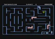 Serpentine is a video maze game written by David Snider for the Apple II and published by Broderbund in 1982.[2][3] Serpentine's gameplay and visuals are similar to the Konami arcade game, Jungler, released the previous year. It was ported to the Commodore 64 and the Atari 8-bit family. A VIC-20 version was licensed to Creative Software.[1]