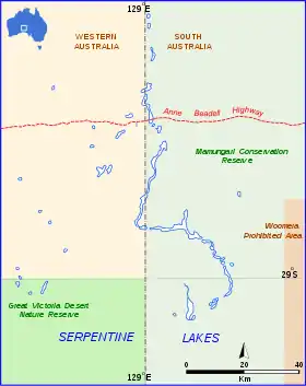 The Serpentine Lakes is a chain of salt lakes in the Great Victoria Desert of Australia. It runs for almost 100 km (62 mi) along the border between South Australia and Western Australia. When full, the lakes cover an area of 9,700 hectares (97 km2). Most of it is located in the Mamungari Conservation Park. The Anne Beadell Highway crosses the northernmost arm of the lake.