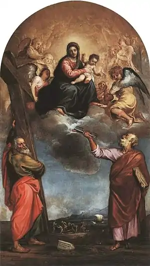 The town council of Serravalle commissioned the painting for the church in spring 1542, initially choosing the local painter Francesco da Milano but later voting to replace him with Titian,[1] who was also commissioned to paint the Castello Roganzuolo Altarpiece that year. The contract with Titian was drawn up in autumn 1512 and total payment eventually amounted to 250 ducats.[2] Probably completed between 1547 and 1548, the work was only delivered in the 1550s thanks to problems over the final payment to the artist - legal disputes over payment continued even after the work's delivery.[3]