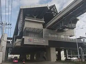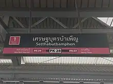 Setthabutbamphen station (Thai: สถานีเศรษฐบุตรบำเพ็ญ) is a Bangkok MRT station on the Pink Line. The station is located on Ram Inthra Road, near Soi Ram Inthra 123 in Min Buri district, Bangkok.[1] The station has four exits and is named after Setthabutbamphen School located nearby.[2] It opened on 21 November 2023 as part of trial operations on the entire Pink Line.[3][4]