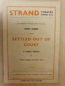 Settled Out of Court is a 1960 comedy thriller play by William Saroyan and Henry Cecil.[1] It appeared at the Strand Theatre in London's West End with a cast including Nigel Patrick, Maxine Audley, Charles Heslop, Eric Pohlmann, John Stratton, Philip Guard and Mary Hignett. Patrick also directed the work.[2]