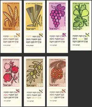 The Seven Species with associated Biblical verse depicted on a set of Israeli stamps issued in 1958