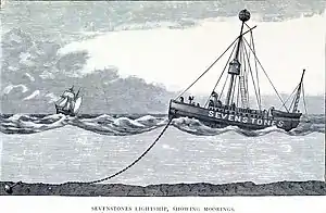 As early as 1826 the government was petitioned to build a light on the reef and a second petition in 1839, supported by the Chamber of Commerce of Waterford, merchants from Liverpool and the Bristol Channel ports resulted in a meeting being held in Falmouth on 21 February 1840. It was declared that a light on or near the reef would shorten the passage around Scilly by up to thirty-six hours.[7] As a result, the first lightship was moored, in 40 fathoms (240 ft; 73 m) on a slate and sand bottom, near the reef on 20 August 1841 and shone its first light on 1 September 1841. Originally there was a crew of ten with five on station at a time.[1] A few months after being placed in position she drifted from her anchorage and was consequently provided with a new "mushroom" anchor which was better suited to lightships. The West Briton of 25 November 1842 reported that her cable parted and she almost became a wreck when she drove over the reef at high tide. The crew steered the ship to New Grimsby, Tresco, from where she was towed back, and on 6 January 1843 she broke adrift again. The following March, she was found drifting in a moderate southwest breeze, and was again towed to New Grimsby. She was towed back to her position on 10 April, and anchored in 42 fathoms (252 ft; 77 m).