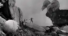The film's original script had a climax that involved two cyclops fighting. In the final version, however, the climactic battle featured a single cyclops versus a dragon. The model of the dragon was more than three feet long and was very difficult to animate; the fight sequence took nearly three weeks for Harryhausen to complete. Originally, it was planned to have the dragon breathing fire from its mouth during the entire sequence, but the cost was deemed too high. So the scenes where it does breathe fire, Harryhausen used a flamethrower, shooting out flames 30 to 40 feet against a night sky, then superimposed the filmed fire very near the dragon's mouth.[11] The dragon model used parts of the model of the Rhedosaurus from The Beast from 20,000 Fathoms.[12]