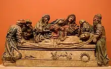 The late 15th century brought significant developments for sculpture in Seville. The influence of the early 15th century Dutch sculptor Claus Sluter arrived by way of Burgundy, where Dutch painter Jan van Eyck was working in the court of Duke Philip the Good. Lorenzo Mercadante, working in the Seville Cathedral, created a series of marble and terracotta sculptures representing this aesthetic. Pedro Millán carried on this tradition, and was its most important exponent in Seville, creating such works as the Virgen del Pilar ("Virgin of the Pillar") at the cathedral—with iconography distinct from the Aragonese iconography of the time—and the groups Varón de Dolores ("Man of Sorrows") and Llanto sobre Cristo muerto ("Lament Over the Dead Christ", pictured above), now in the Museum of Fine Arts of Seville. The great altarpiece of the Seville Cathedral is architecturally Gothic; over the course of a century it acquired thousands of figures arranged in various sacred stories, created by important artists, and which are worked with utmost care even when they are placed very far up in the structure.