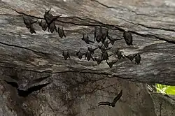 Territorial songs are the most noticeable vocalizations in a colony with 10-50 tonal calls that first have an upward FM, then a V-shaped call in the middle, ending with a lower fundamental frequency that is headed by a noisy buzz.[8] The territorial calls can last anywhere from 10 ms to 100 ms and their structure can vary throughout the day.[8] Complex songs in mammals are rare and uncommon in S. bilineata but are used as courtship songs by males. The complex courtship songs also allow for individual identification of males by females in the species S. bilineata.[8] These courtship calls will only happen after territorial calls are finished in the morning and before territorial calls start in the evening and require ultrasound recording systems because they are above 20 kHz, that is, out of human hearing range (About 20 Hz - 20 kHz).[8] These courtship songs also can last for up to 1 hour while being directed at a single female.[8] As mentioned, S. bilineata are in the same family as C. seychellensis and while there is not as much known for C. seychellensis, 4 types of calls have been categorized specifically for C. seychellensis: complex calls, orientation calls, orientation calls in open areas, and foraging calls.[9]