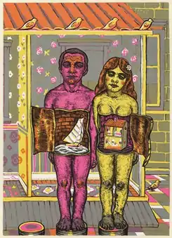 Time spent in Paris on a fellowship led to a greater surrealist turn in Rosofsky's work, realized in a fantastical, frightening vocabulary of clowns, menacing faces, and bizarre scenarios urgency and a more intense color palette.[2] He often employed these figures in works examining power (e.g., his sardonic depiction of Chicago politics, Daley Machine, 1968) and social issues (Homage to Spain, Thalidomide Children and Others, 1965) that in their focus on generalized dehumanization shared more with New York artist George Tooker, than with Rosofsky's former classmate, Leon Golub's more political work.[24][2] By the 1970s, Rosofsky turned to caustic depictions of fraught male-female relationships and roles that portrayed cardboard cutouts or stage puppet-like men and women, enacting disturbing scenes in theatrical domestic scenes, such as The Couple (1973) or The Love Fountain (1967).[2][24] Rosofsky's last works were lighter and more detached, and included "commedia dell'arte" drawings commissioned for the 1982 Venice Biennale's Carnevale del Teatro.[2]