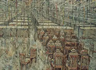 Rosofsky was drawn to doleful and withering themes, such as the individual's loss of power in modern life, fraught male-female relationships, the abuse of power and the absurdity of war, often borne out in battered, distorted, sometimes grotesquely comic figures in haunting, fantastical interiors and cityscapes.[11][17][2] A lifelong Chicagoan, Rosofsky is considered the post-war artist for whom Chicago—the lake, people, buildings, and abrasive character—was most integral, his bizarre figures and settings often bearing a specificity to the city's locales and conditions.[11][2] Critic Alan Artner described him as a "poet of exhaustion" depicting an urban carnival of malaise, "disappointment and dejection, of things passing away without proper eulogy, of winter and fading light."[24]
