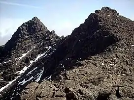 ![]() Looking east from the Cuillin ridge to Sgùrr Dubh Mòr on the left and Sgurr Dubh an Da Bhein on the right. | |