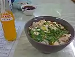 | Gourd head | 葫蘆頭 | 葫芦头 | húlú tóu | ![]() | A dish made from pig's large intestine. It is called "gourd head" because the pig's large intestine looks like the top of a gourd. It originated as street food during the Northern Song dynasty. Since then, the dish has evolved to include variations with meat fillings inside the pig's large intestine, as well as the inclusion of other ingredients. Pictured with bottle of Ice Peak soda. |