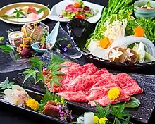 Shabu-shabu (Japanese: しゃぶしゃぶ, romanized: shabushabu) is a Japanese nabemono hotpot dish of thinly sliced meat and vegetables boiled in water and served with dipping sauces.[1] The term is onomatopoeic, derived from the sound – "swish swish" – emitted when the ingredients are stirred in the cooking pot.[2] The food is cooked piece by piece by the diner at the table. Shabu-shabu is generally more savory and less sweet than sukiyaki, another hot pot dish.
