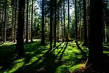 Under a dense forest canopy, light intensity can be very low. Special adaptations produce the shade tolerance that allows plants to survive in the understory. In addition, shade within a canopy can elicit shade avoidance responses whereby plants elongate their shoots in order to reach light for optimal photosynthesis.[1]