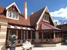 The southern front projection features a bay window with corrugated iron roof and awning. At the northern end, French doors open onto a faceted balcony with a steeply-pitched iron roof and cast-iron balustrading of a circle and cross-brace pattern. The main entrance is defined by a rendered masonry portico off-set to the south of the small front verandah.[1]