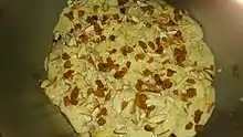 Shahi Tukra is type of bread pudding which originated in South Asia during the Mughal era in the 1600s.[1][2] The literal translation of Shahi Tukra is royal piece or bite.[1] Shahi tukre originated in the Mughal Empire when Indian chefs made this dish to present to royal Mughal courts.[3] The white bread is fried in oil/ghee after which milk and sugar is added.[4][5] The dish is flavored using saffron, cloves, and cardamom.[6][7]