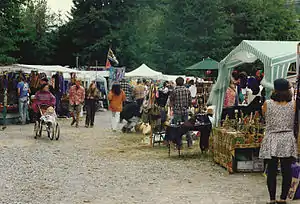 Shakedown Street is the area of a jam band parking lot where the vending takes place.[1][2][3] It is named after the Grateful Dead song of the same name,[1][4][5] and began in the early 1980s in the parking lots at Grateful Dead concerts.[1] Items sold have included food, beverages and alcoholic beverages, clothing (such as T-shirts)[6] and jewelry,[1][4] among others. Ticket scalping may also occur.[1]