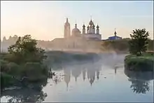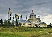 The monastery has been known since the mid-15th century.[1] It was looted by Poles in 1619 and ravaged by brigands in 1624. Work on the surviving five-domed katholikon (main church) began after a fire in 1645. At that time the monastery was transferred to its current location near the confluence of the Molokhta and Teza Rivers. The new location was so advantageous for trade that an annual fair sprang up near the monastery, attracting merchants from all over Zalesye and Upper Volga regions. The second surviving church was completed and consecrated in 1678.