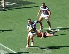 In round 20, against the Brisbane Broncos, Kenny-Dowall scored 4 tries in the 34–30 win at Suncorp Stadium,[15] becoming the first Rooster in 35 years to score 4 tries in a single match. In the Roosters qualifying final match, against the Wests Tigers at the SFS, Kenny-Dowall scored the winning try in golden point extra time by intercepting the ball and running 70 metres downfield to win the match for the Roosters 19–15.[16] Kenny-Dowall played at centre in the Roosters 2010 NRL Grand Final 32–8 loss to the St George Illawarra Dragons.[17] Kenny-Dowall played in all the Roosters 28 matches and scored 21 tries being the 2010 NRL season's highest tryscorer along with Newcastle's Akuila Uate. Kenny-Dowall cemented his position in the centres for the Kiwis in the 2010 Four Nations series, scoring three tries including one in the final. Kenny-Dowall combined with Benji Marshall, Jason Nightingale and Nathan Fien to set up the series winning 79th minute try.[18] Kenny-Dowall's form throughout 2010 saw him runner up to Marshall in the Rugby League World Golden Boot Award, where he made centre in the team of the year.[19]