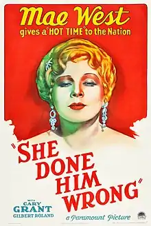 She Done Him Wrong is a 1933 pre-Code American crime/comedy film starring Mae West and Cary Grant, directed by Lowell Sherman. The plot includes melodramatic and musical elements, with a supporting cast featuring Owen Moore, Gilbert Roland, Noah Beery Sr., Rochelle Hudson, and Louise Beavers. The film was adapted from the successful 1928 Broadway play Diamond Lil by Mae West. The film is famous for West's many double entendres and quips, including her best-known "Why don't you come up sometime and see me?".[3] She Done Him Wrong was a box-office success and the film was nominated for an Academy Award for Best Picture.