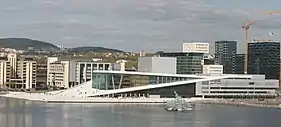 She Lies is a public sculpture by Monica Bonvicini made of stainless steel and glass panels, measuring approximately 12 metres (39 ft) by 17 metres (56 ft) by 16 metres (52 ft), next to the Oslo Opera House in Norway.