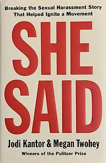 She Said: Breaking the Sexual Harassment Story That Helped Ignite a Movement is a 2019 nonfiction book written by Jodi Kantor and Megan Twohey, two New York Times investigative reporters who exposed Harvey Weinstein's history of abuse and sexual misconduct against women, a catalyst for the burgeoning MeToo movement.[1][2][3][4] The book was published on September 10, 2019 by Penguin Press.[5][6]