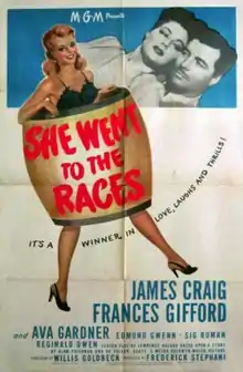 She Went to the Races is a 1945 American comedy film directed by Willis Goldbeck and starring James Craig, Frances Gifford and Ava Gardner.[1] The screenplay concerns a team of scientists who discover a seemingly foolproof way of discovering the winner of horse races.