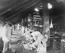 Roberts modelled his painting on a shearing shed at what is now called Killeneen, an outstation of the 24,000-hectare (59,000-acre) Brocklesby sheep station, near Corowa in the Riverina region of New South Wales.[3] The property was owned by the Anderson family, distant relations to Roberts, who first visited the station in 1886 to attend a family wedding.[4] Having decided on shearing as the subject for a painting, Roberts arrived at Brocklesby in the spring of 1888, making around 70 or 80 preliminary sketches of "the light, the atmosphere, the sheep, the men and the work" before returning to the station the following shearing season with his canvas.[5] Roberts' work was noted by the local press with reports of him "dressed in blue shirt and moleskins ... giving the last finishing touches to a picture in oils about 5ft by 4ft."[4]