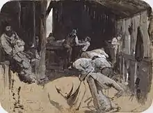 Art historians had previously thought Roberts completed most of the painting in his Melbourne studio, using the sketches drawn in his time at Brocklesby.[4] In 2003 however, art critic and historian Paul Johnson wrote: "Tom Roberts spent two years, on the spot, painting Shearing the Rams".[6] New evidence was brought to light in 2006 that suggested that Roberts painted much of the work en plein air at the shearing shed itself.[4] In 2006, The National Gallery of Victoria (NGV) conducted a scientific examination of paint left on a piece of timber salvaged from the now-destroyed shed, where it was thought that Roberts cleaned his brushes. The study confirmed that the paint, in a number of different shades, precisely matched the paint used in the painting. The senior curator of art at the NGV, Terence Lane, believes this is strong evidence that much of the work was done on location: "For me, that's evidence of a lot of time spent in that woolshed ... all those paint marks and the selection of colours indicates he spent so much time en plein air".[4]