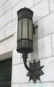 Shedd Aquarium is also notable for its architecture. The basic design, by architectural firm Graham, Anderson, Probst & White,[45] is taken from classical Greek architecture, more specifically Beaux Arts, to match the other structures of the Museum Campus. The central aquarium building is octagonal, fronted by Doric columns and a formal staircase and topped by a dome. Aquatic motifs are worked in at every opportunity; tortoise shells, dolphins, octopuses, waves, and even the Trident of Poseidon can be found all over the aquarium's exterior and interior. Improving upon its predecessor inland aquarium, the Belle Isle Aquarium in Detroit, extensive use was made of designs by Mary Chase Perry Stratton, incorporating her custom-made Pewabic Pottery tile.[46] The Oceanarium is done in a more modern style representing the Pacific Northwest, but one that blends with the older part of the building. "Whale Harbor", the Oceanarium's 2-million-US-gallon (7,600,000 L) main tank, is backed by a wall of windows that look out onto Lake Michigan.