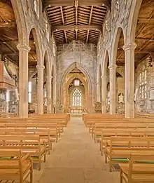In the 1880s further reconstruction and rebuilding removed the galleries, moved the organ to the north transept to clear the chancel, and installed new oak pews.[13] The north and south transepts and west end were extended. A screen was constructed by local craftsmen for the Shrewsbury Chapel but was modified and moved to the north aisle in the 1900s.[13][14] During later restoration work in 2013, it was discovered that a number of the Shrewsbury coffins were missing from the crypt.[15]