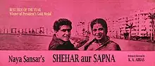 Shehar Aur Sapna (lit. 'The City and the Dream') is a 1963 Hindi film directed by Khwaja Ahmad Abbas, about a young couple searching in vain for a home of their own in a metropolis, amidst the backdrop of rapidly developing city, and the many who flocked to it in hope of a better life.[1] It won the 1964 National Film Award for Best Feature Film and was nominated for Filmfare Award for Best Film.