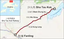 In 1911, the Sha Tau Kok Railway was opened as far as Shek Chung Au. The light railway was then extended to Sha Tau Kok in 1912.[6] Shek Chung Au Station (石涌凹站) remained as one of the five stations of the line.[7]
