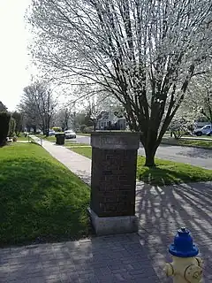 The sole non-building contributing feature of the district is the eastern entrance to Shelby Place, which consists of two five-feet tall square brick columns on concrete bases which are original to the district. Both have concrete caps which say "Shelby Place" on them. Two similar columns once occupied the western entrance of the district, but nothing remains of the northwestern column, and the southwestern has only remnants.[2]: Sec. 7, Pg. 19
